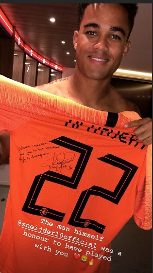 Justin Kluivert, dopo i sette minuti giocati ieri sera con l'Olanda, si è portato a casa un souvenir: la maglia con la dedica di Wesley Sneijder: "È stato un onore aver giocato con te". Questo il commento del calciatore giallorosso.