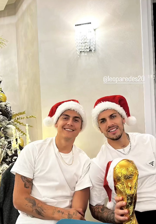 Paulo Dybala e Leandro Paredes stanno trascorrendo il Natale insieme. I due compagni di squadra e di nazionale, come mostrato da una storia Instagram pubblicata dall'attaccante, hanno in mano la Coppa del Mondo vinta un anno fa in Qatar e appaiono decisamente sorridenti.