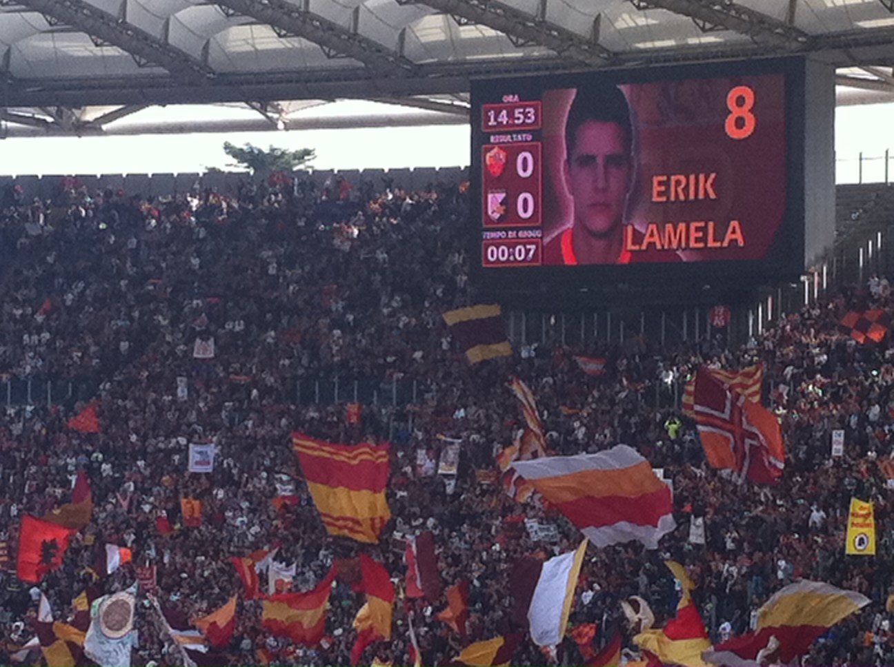 7- GOOOOOOOOL!!!!!!!!!!!! LAMELAAAAAA!!!!!!! Migliaccio perde palle, Lamela recupera e dalla fascia sinistra lancia direttamente sul secondo palo. Francesco Totti, dalla tribuna, si alza in piedi ad applaudire.