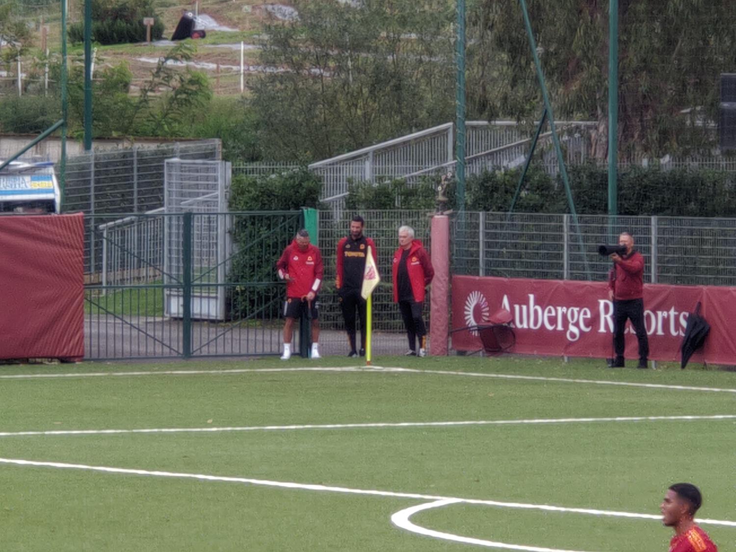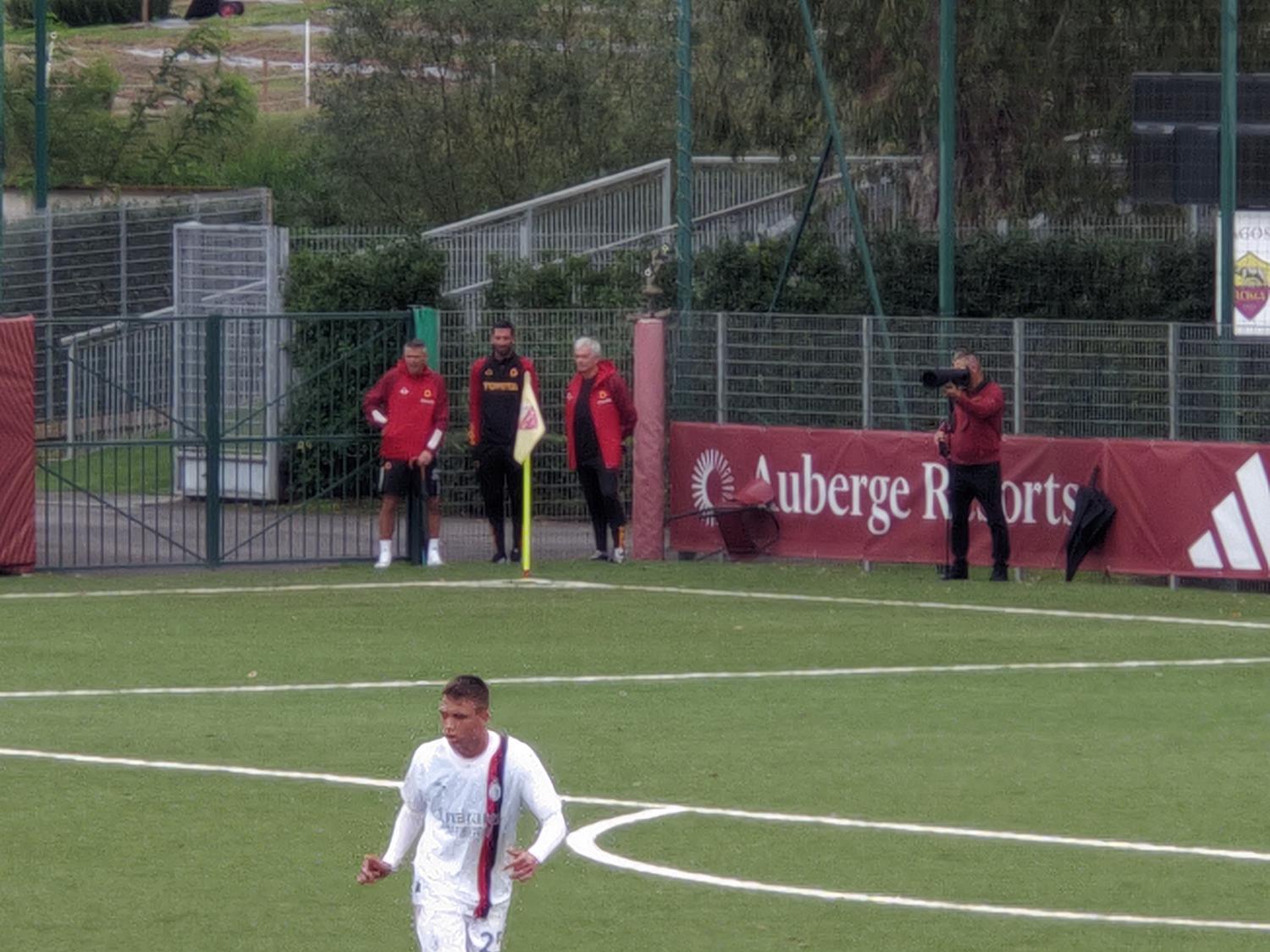 La Roma Primavera sta giocando contro il Milan al Centro Sportivo "Fulvio Bernardini" di Trigoria. A bordocampo - precisamente vicino alla bandierina destra lato Curva Sud - ci sono José Mourinho, Salvatore Foti e Nuno Santos, che assistono alla gara dei giovani giallorossi.