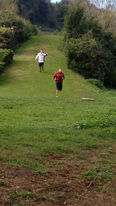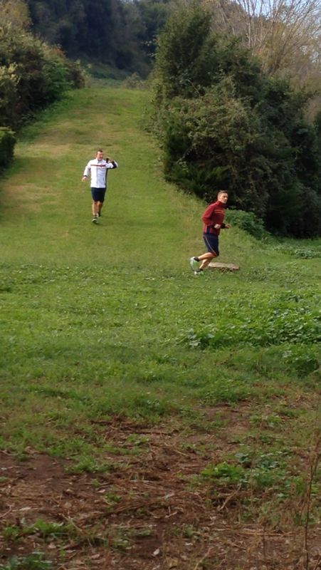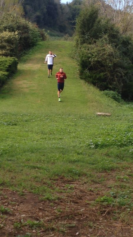 12.20 - Marco Borriello sta scendendo sul Campo Testaccio con Luca Franceschi, addetto al recupero infortunati. La squadra svolge partitelle a tema.