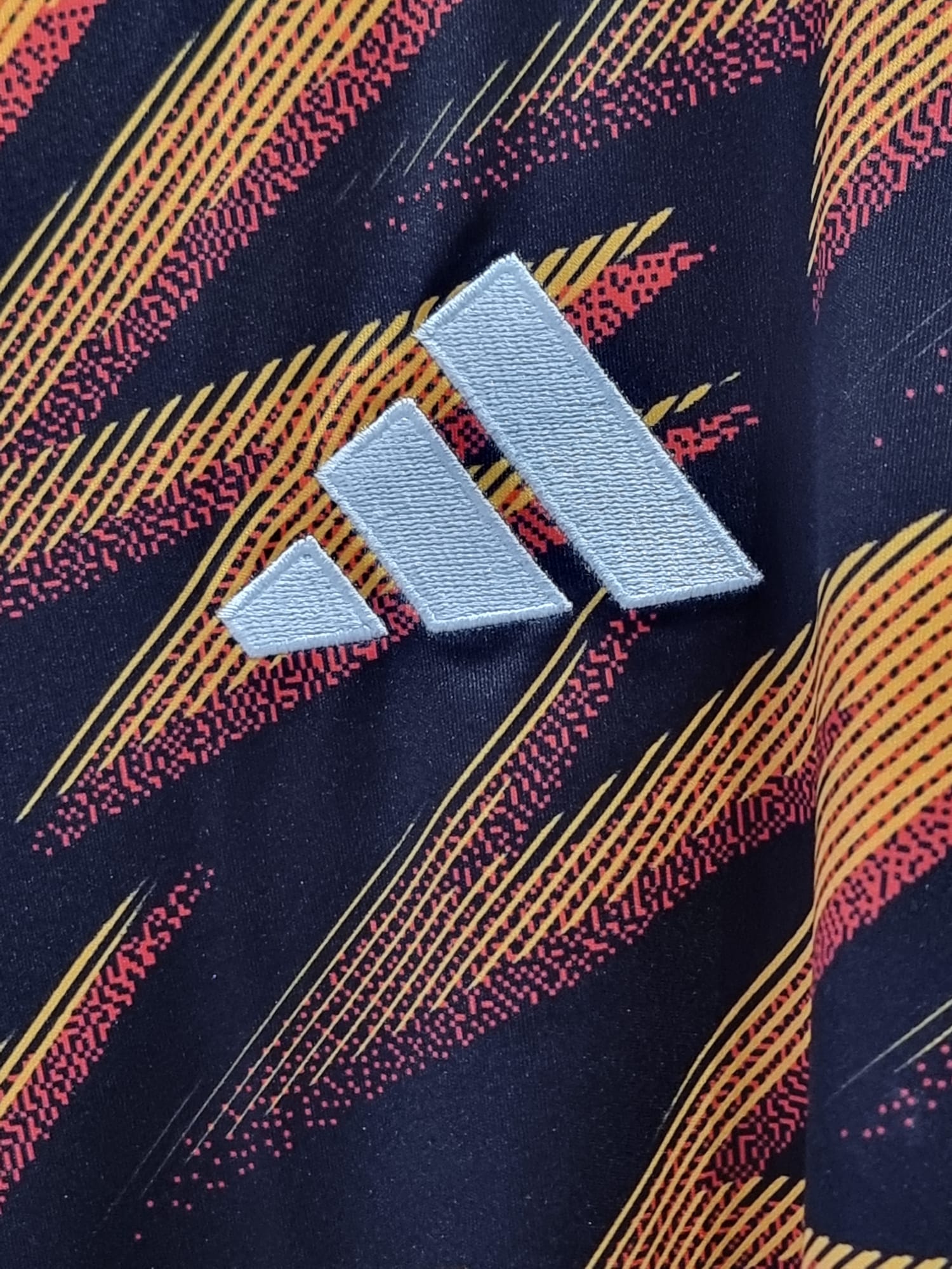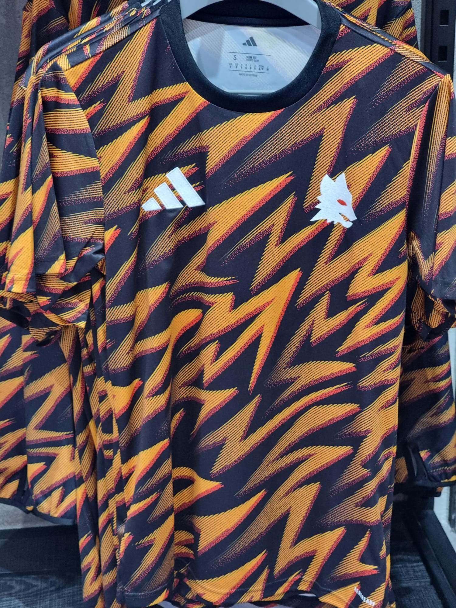 KIT PRE GARA - Oltre alla divisa da gara, la Roma ha presentato anche il nuovo kit pre-gara, che introduce un’estetica completamente inedita: una base nera, arricchita da sfumature gialle e arancioni, che conferiscono alla maglia un aspetto audace e moderno. Il design è completato da due elementi iconici: il celebre lupetto stilizzato, simbolo caro alla tifoseria, e lo stemma Adidas, partner tecnico del club.