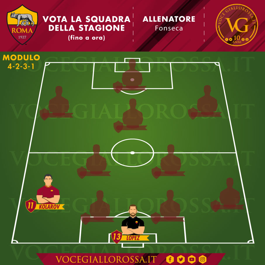 La stagione della Roma è ferma dalla bella vittoria contro il Cagliari. Da allora sui campi di calcio, come in tutto il mondo, protagonista è stata la pandemia legata al Covid-19. In attesa della fine del lockdown e il ritorno graduale alla normalità e di conseguenza anche alla possibilità di ricominciare col calcio giocato e terminare la stagione, Vocegiallorossa.it vi chiede di scegliere il VG Team of the Season (fino a ora) della Roma. Ogni giorno vi chiederemo di scegliere, ruolo per ruolo, il giocatore che andrà a comporre l'11 migliore, schierato nel 4-2-3-1 canonico di mister Fonseca.