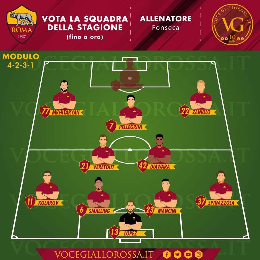 La stagione della Roma è ferma dalla bella vittoria contro il Cagliari. Da allora sui campi di calcio, come in tutto il mondo, protagonista è stata la pandemia legata al Covid-19. In attesa della fine del lockdown e il ritorno graduale alla normalità e di conseguenza anche alla possibilità di ricominciare col calcio giocato e terminare la stagione, Vocegiallorossa.it vi chiede di scegliere il VG Team of the Season (fino a ora) della Roma. Ogni giorno vi chiederemo di scegliere, ruolo per ruolo, il giocatore che andrà a comporre l'11 migliore, schierato nel 4-2-3-1 canonico di mister Fonseca.